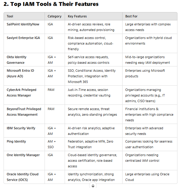 🔹 Best Tools: SailPoint, Saviynt, Okta Identity Governance, One Identity